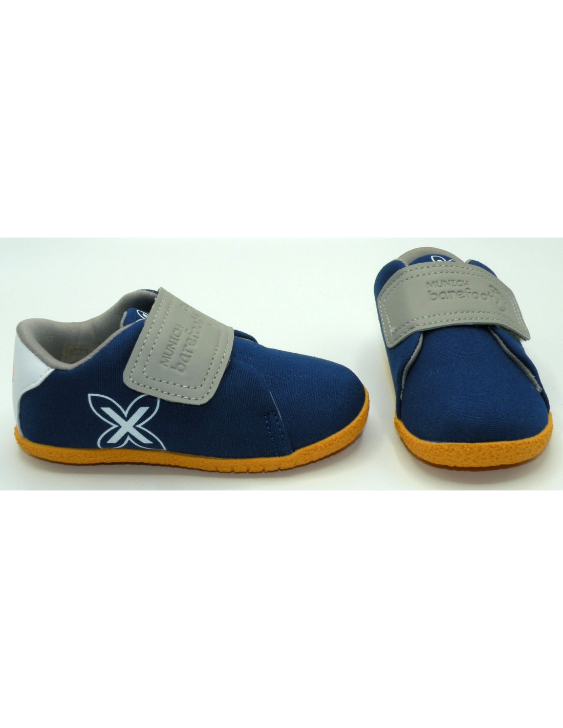 Deportiva de lona en color azul/naranja, horma BAREFOOT, velcro y piso de goma antideslizante.