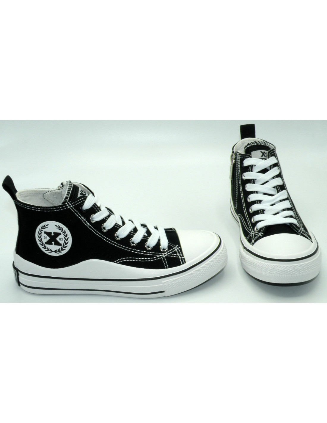 Zapatilla de lona en color negro, cordones y cremallera lateral, piso de goma antideslizante.