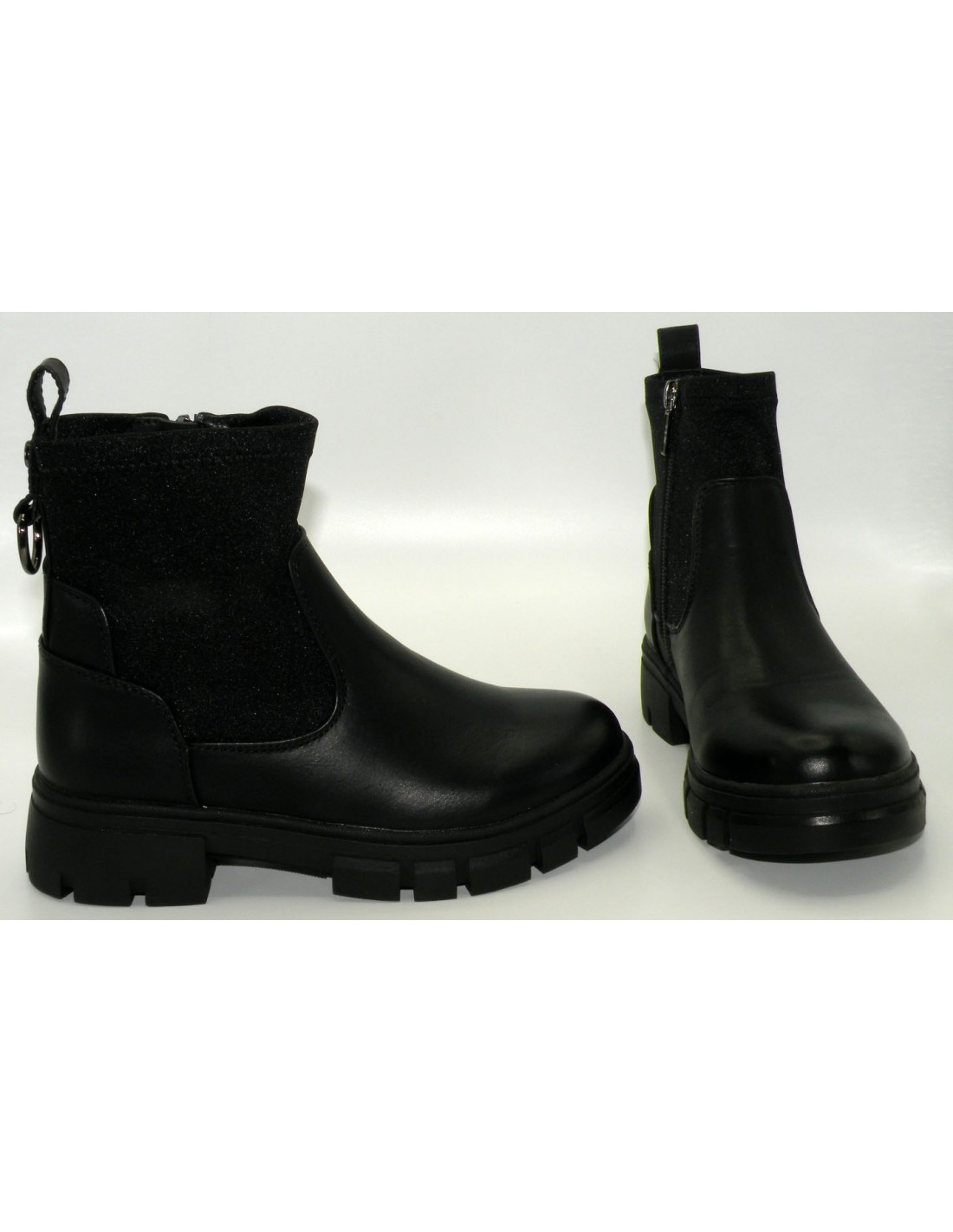 Botín en sintético de color negro con caña de licra, cremallera y piso de goma antideslizante. OJO CALZA GRANDE.