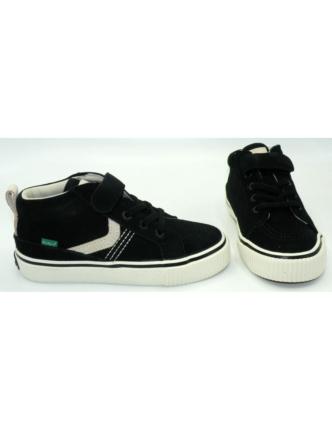 Zapato abotinado en piel serraje de color negro/blanco, cordón elástico y velcro, piso de goma antideslizante.