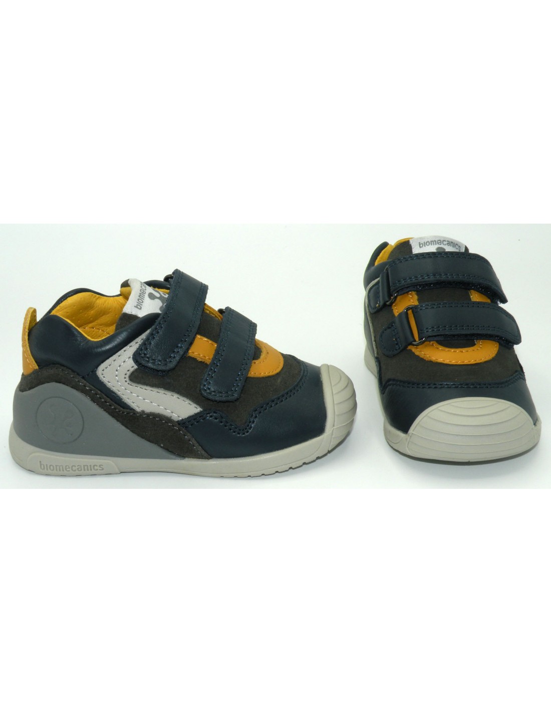 Zapato en piel de color marino/amarillo, con 2 velcros, puntera reforzada y piso flexible de goma antideslizante.