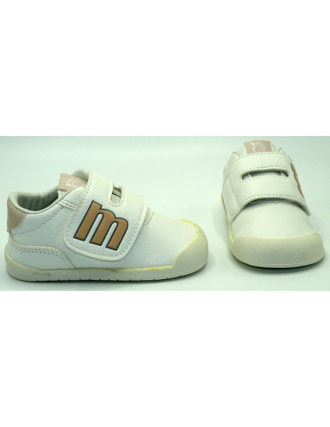 Zapato deportivo en color blanco/rosa, horma respetuosa, velcro y piso flexible de goma antideslizante.