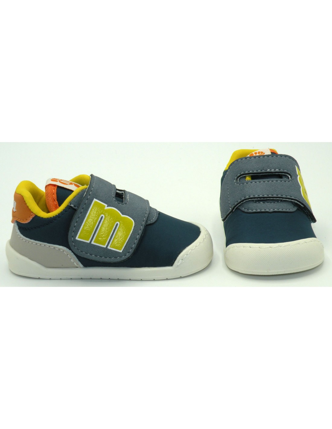 Zapato deportivo en sintético/textil, en color azul/amarillo, horma respetuosa, velcro y piso flexible de goma antideslizante.