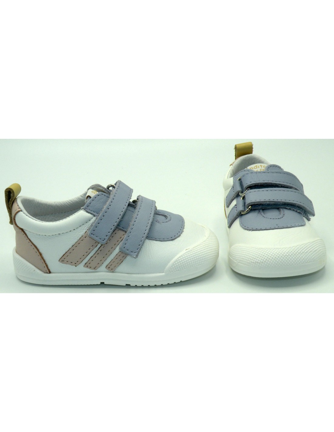 Zapato respetuoso en piel de color blanco/lila/rosa, con cierre de dos velcros y piso flexible de goma antideslizante.