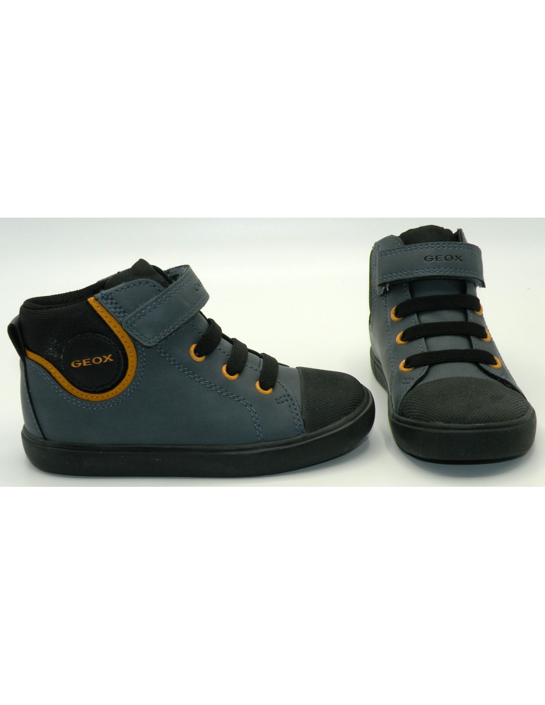 Zapato abotinado en sintético de color azul/negro/ocre, con goma elástica y velcro, puntera reforzada y piso flexible y transpirable de goma antideslizante.