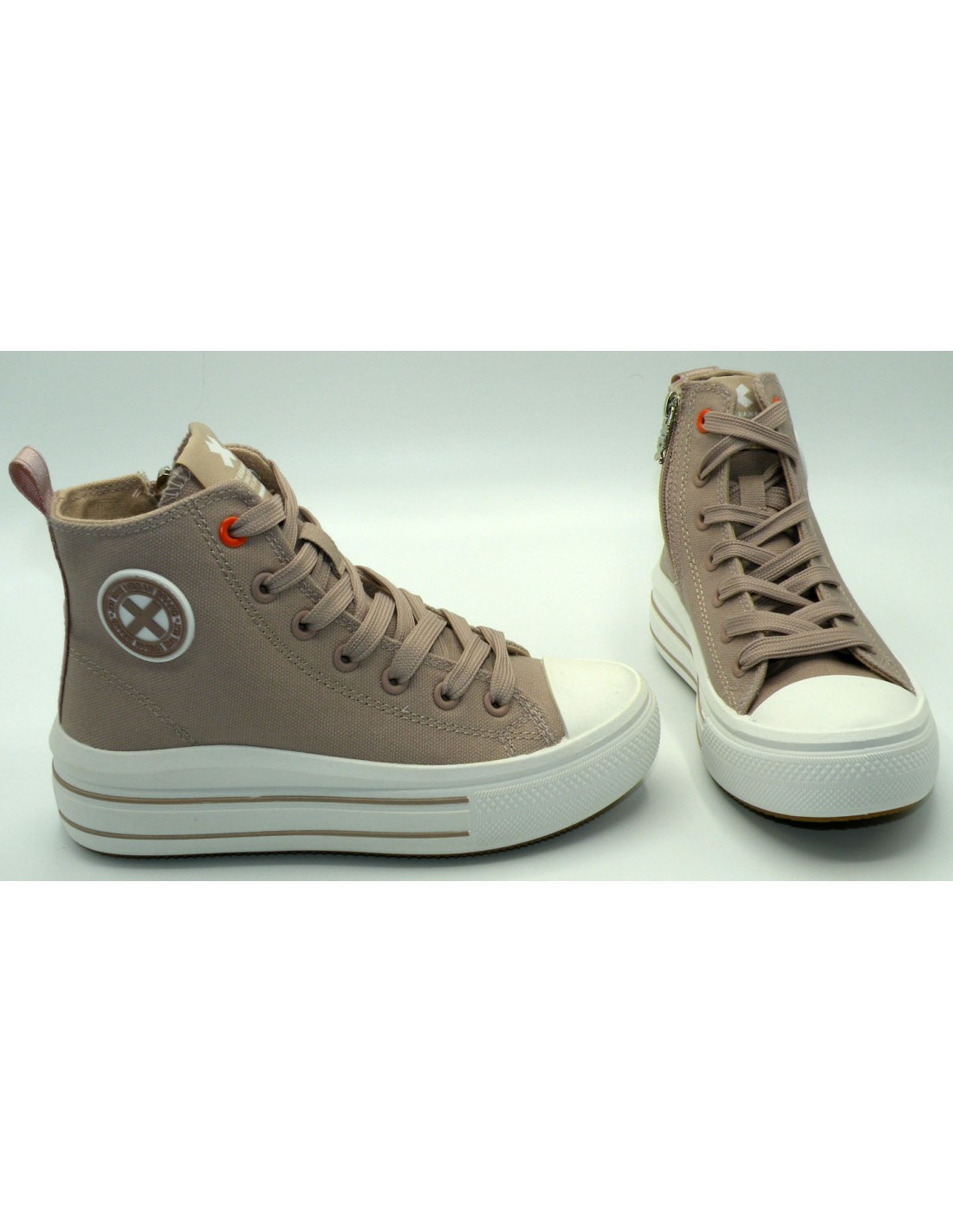 Deportiva abotinada en textil de color nude, con cordones ajustables y cremallera, con puntera de goma reforzada y piso de goma antideslizante.