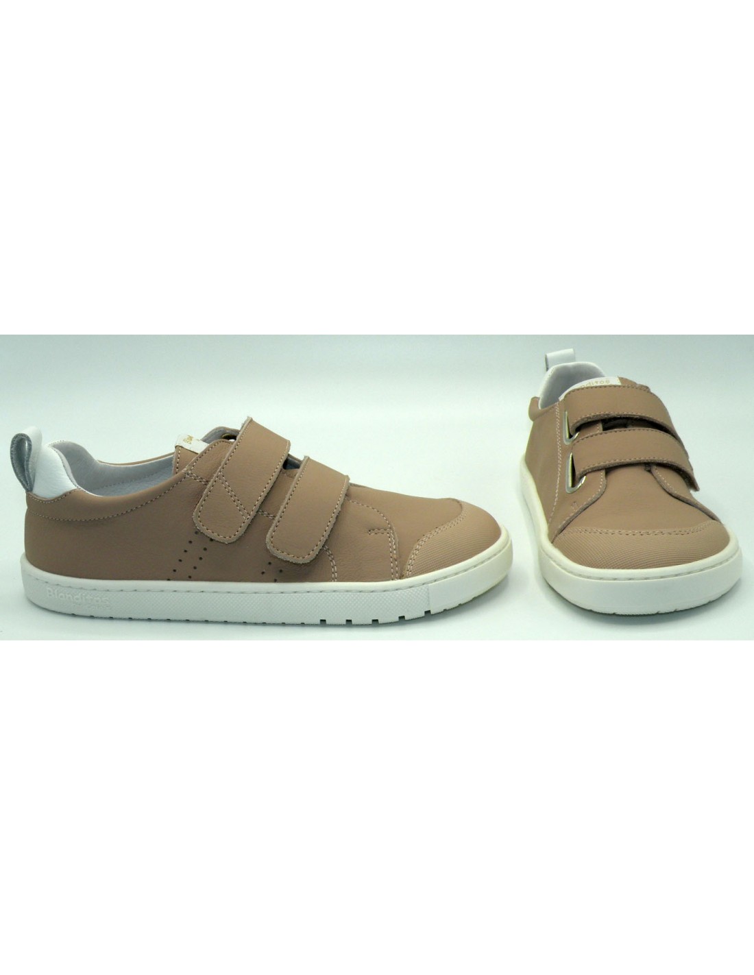 Zapato de horma respetuosa de piel, de color rosa palo, forrado de piel en su interior, con cierre de dos velcros ajustables, piso fino, sin drop y suela de goma antideslizante.