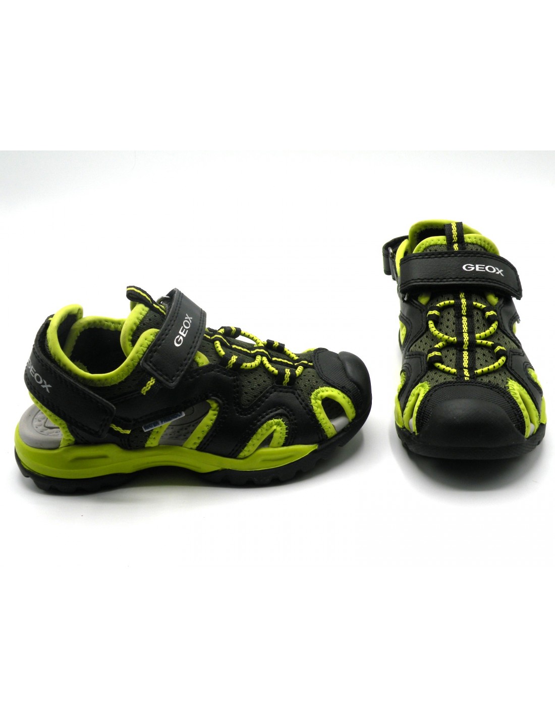 Sandalia de niño en sintético de color negro/verde, velcro en el empeine y la talonera, planta de goma y piso transpirable de goma antideslizante. SE PUEDE MOJAR.