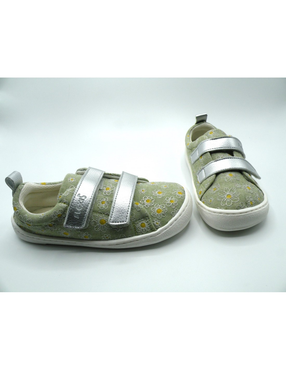 Zapatilla de lona barefoot, en color verde con estampado de flores, 2 velcros en laminado plata, piso flexible de goma antideslizante.