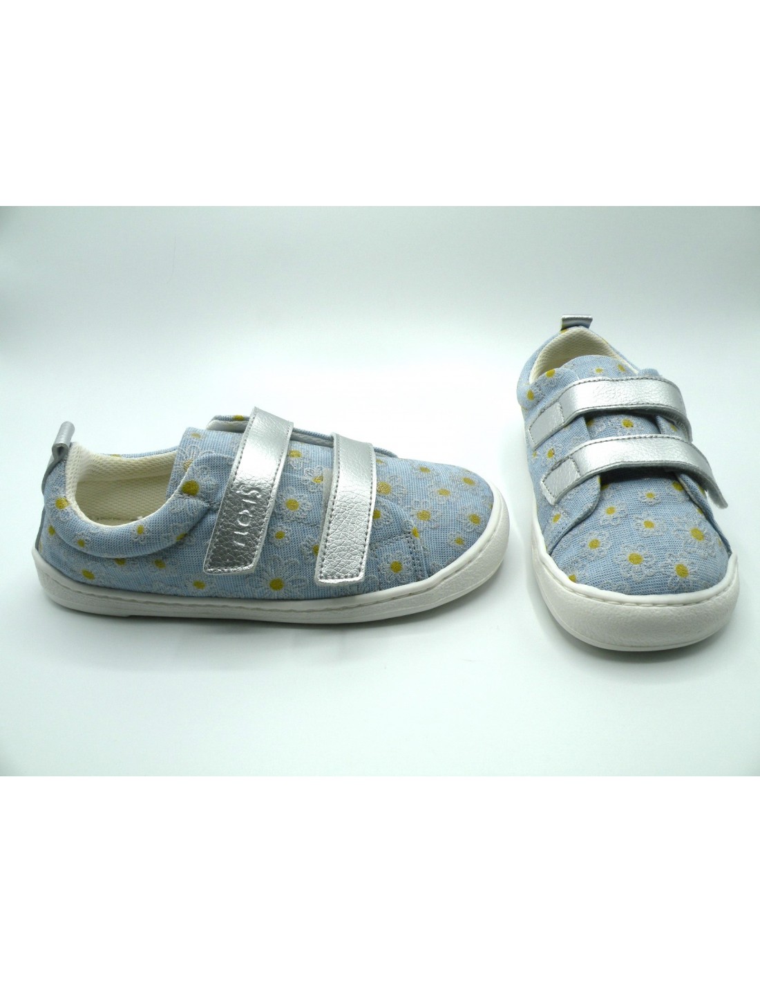 Zapatilla barefoot de lona en color celeste con estampado de flores, 2 velcros en laminado plata, piso flexible de goma antideslizante.