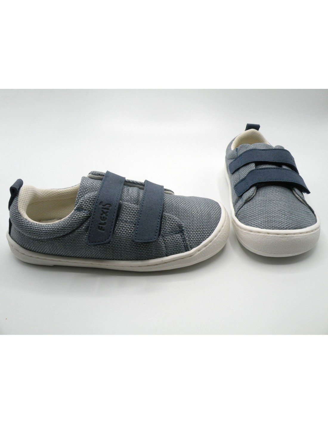 Zapatilla barefoot de lona en color azul índigo, 2 velcros y piso flexible de goma antideslizante.