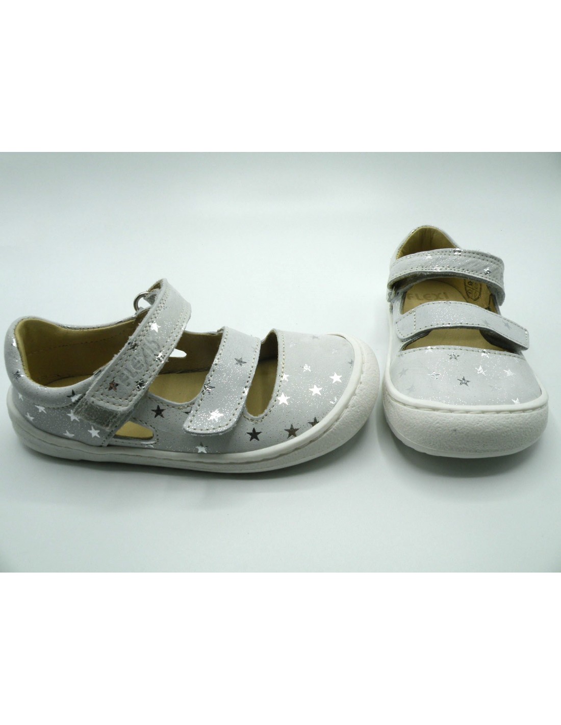 Zapato de primavera barefoot en piel de color hielo con estampado de estrellas en plata, 2 velcros y piso flexible de goma antideslizante.