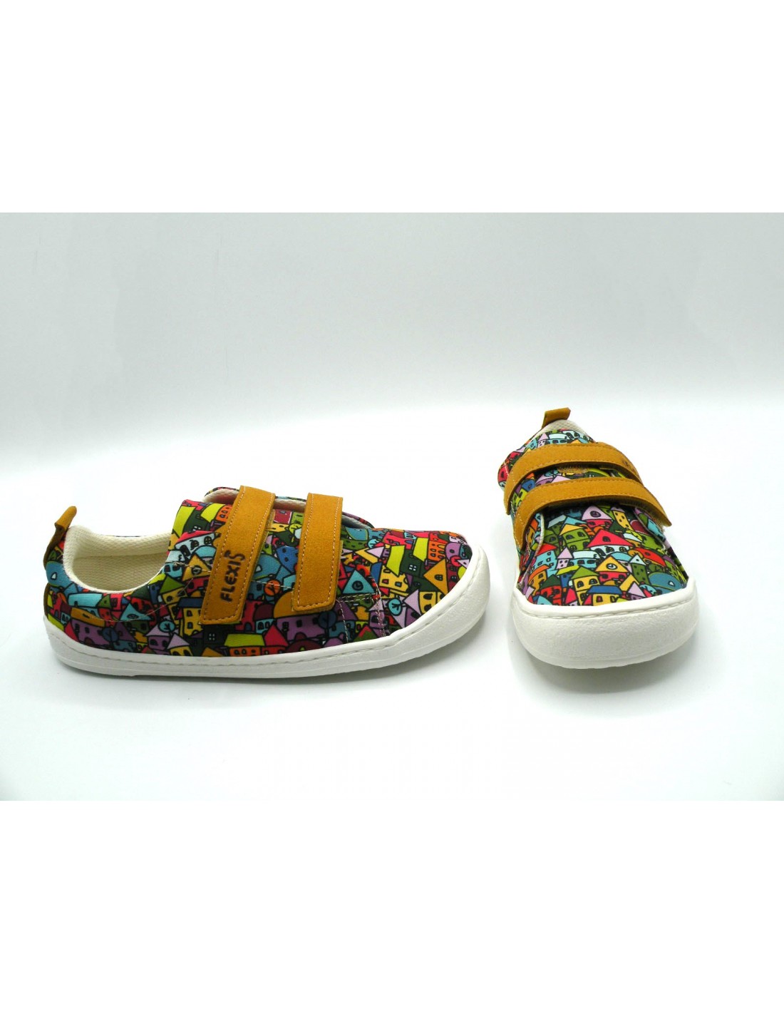 Zapatilla barefoot de lona con estampado de casitas en multicolor y velcros en mostaza, piso flexible de goma antideslizante.