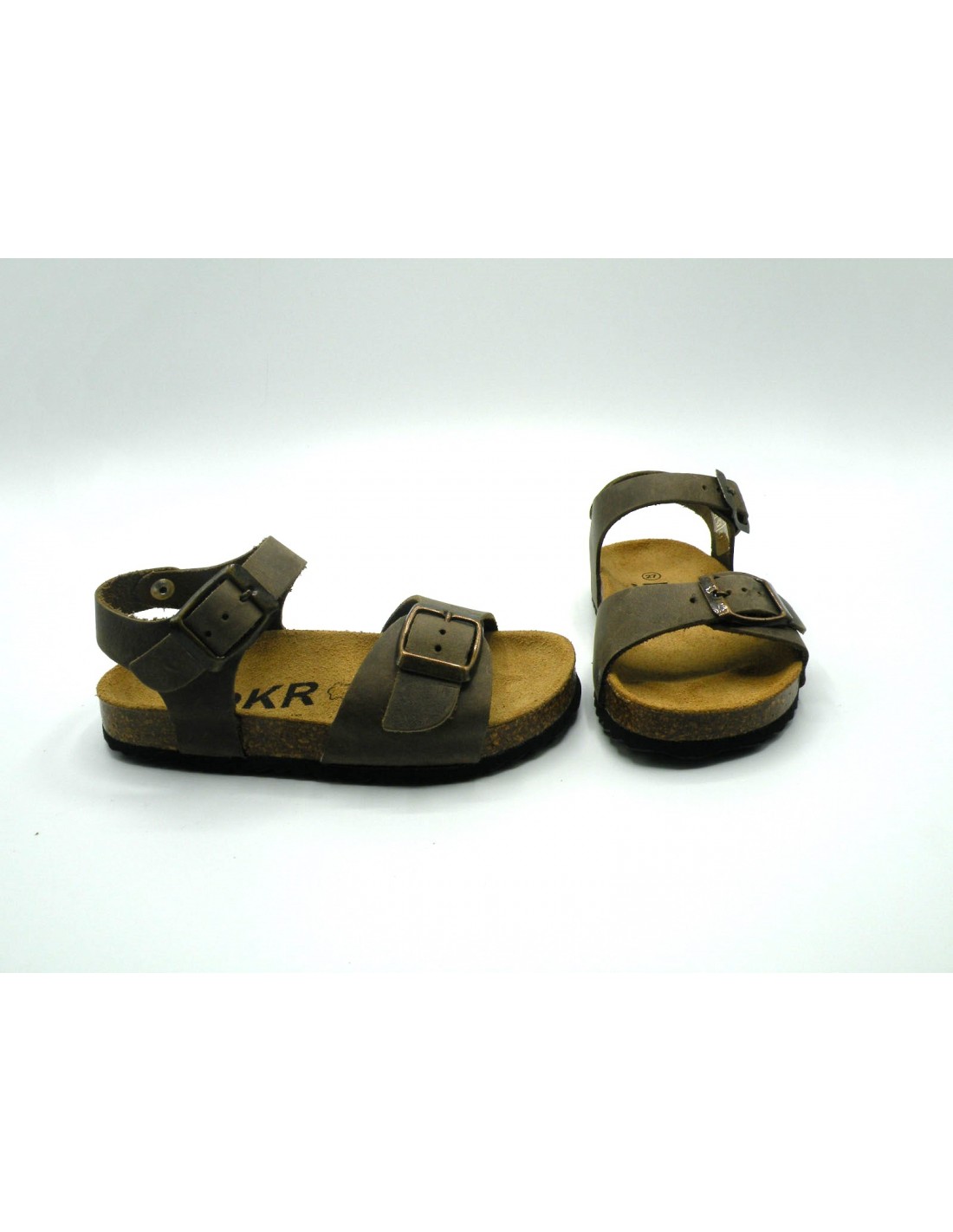 Sandalia tipo bio en piel de color marrón, 2 hebillas, planta anatómica acolchada en piel, piso de goma antideslizante.