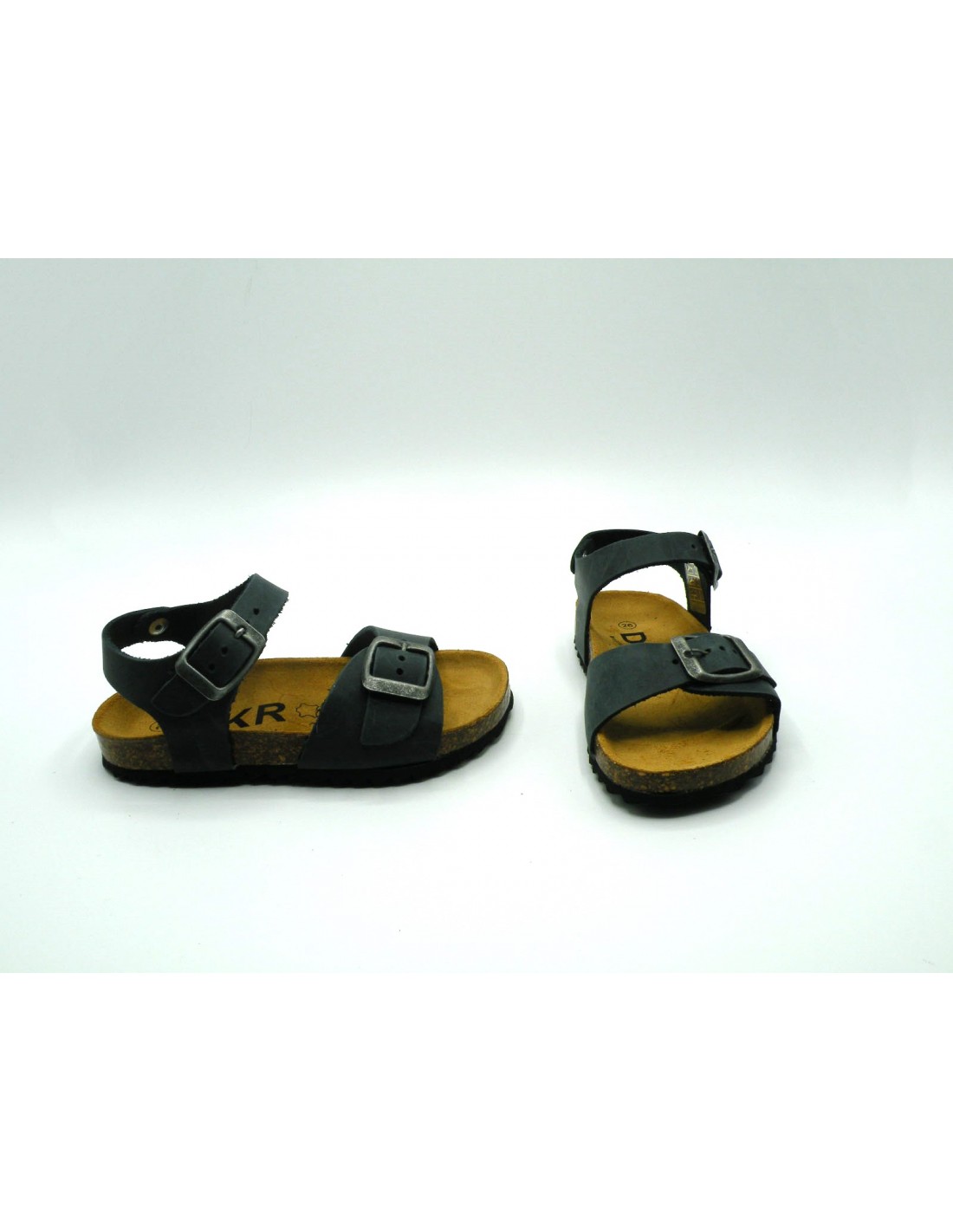 Sandalia tipo bio en piel de color jeans, con 2 hebillas, planta anatómica y acolchada en piel, piso de goma antideslizante.