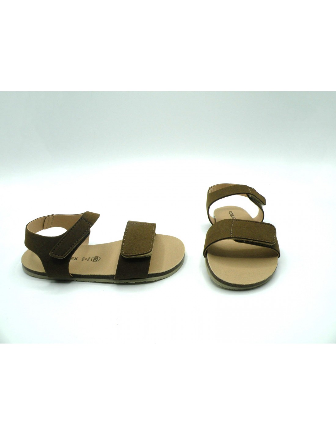 Sandalia barefoot en microfibra de color marrón, 2 velcros, planta de piel y piso flexible de goma antideslizante.