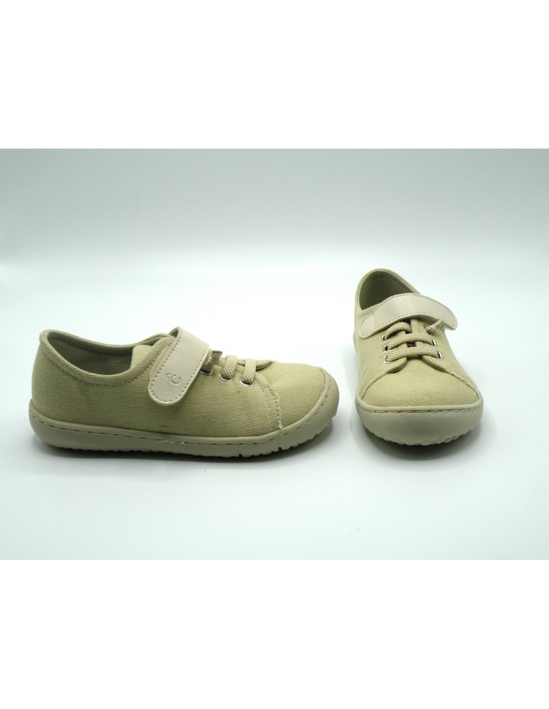Zapato barefoot de lona en color beig, cordón elástico y velcro, piso flexible de goma antideslizante.