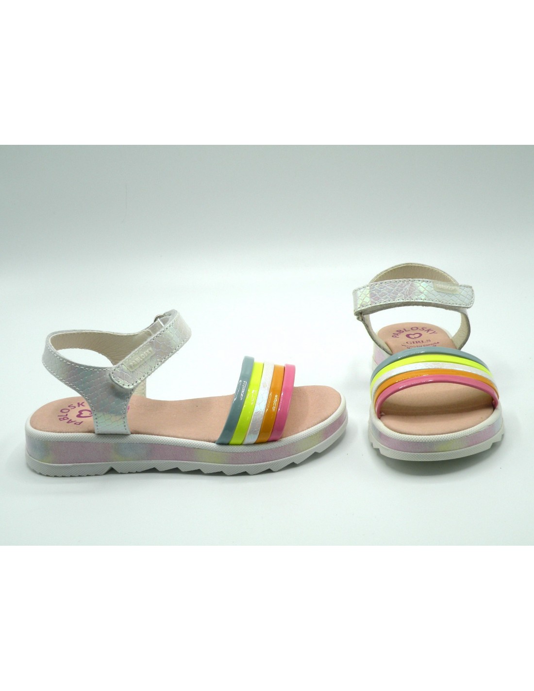 Sandalia en sintético acharolado de color blanco con pala en multicolor, planta acolchada en intech transpirable, velcro y piso de goma antideslizante.