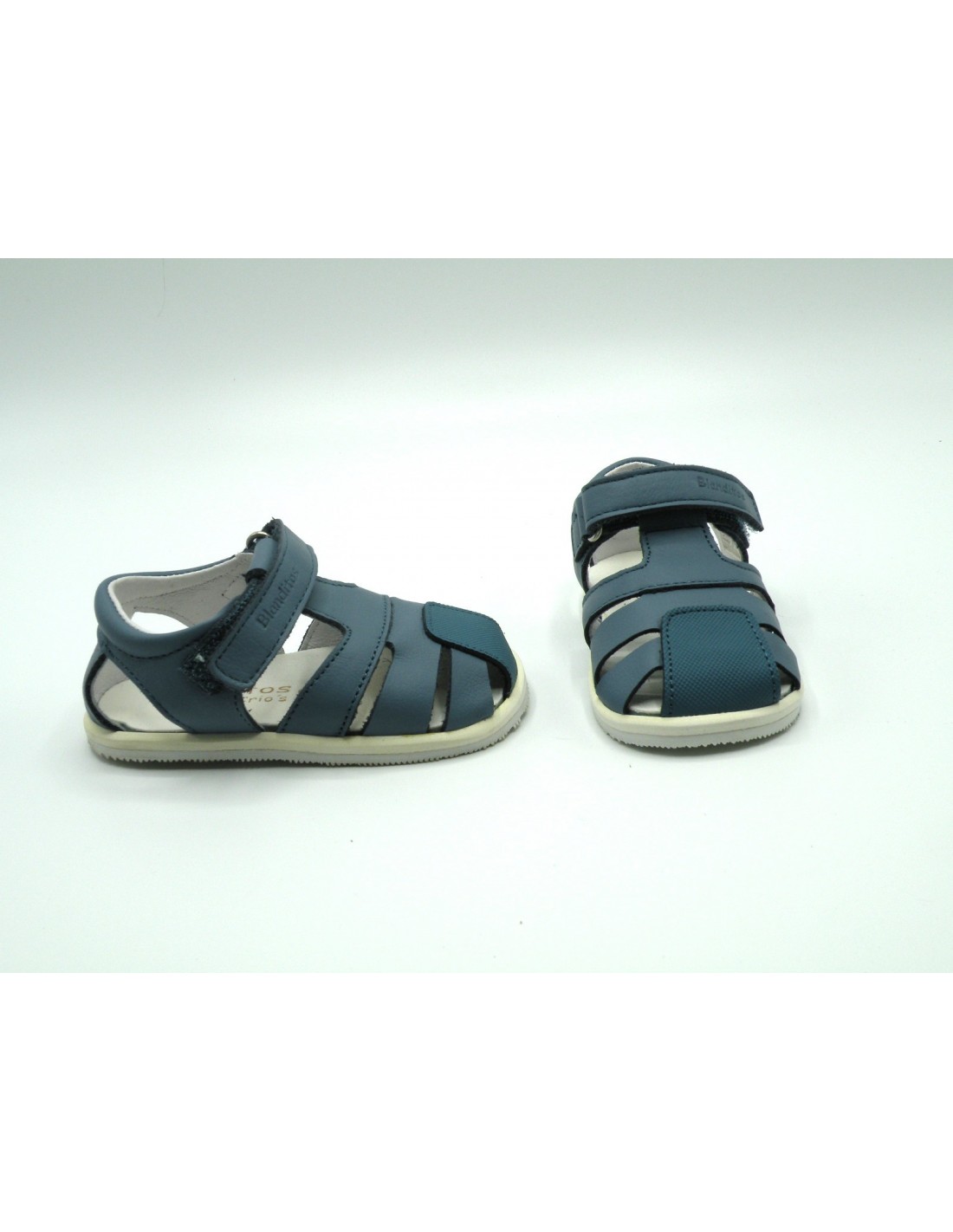 Sandalias barefoot en piel de color azul azafata, con puntera y talonera cerrada, velcro y piso de goma antideslizante.
