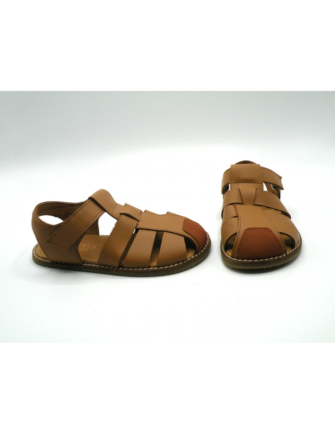 Sandalia barefoot en piel de color cuero, velcro, puntera cerrada y piso flexible de goma antideslizante.
