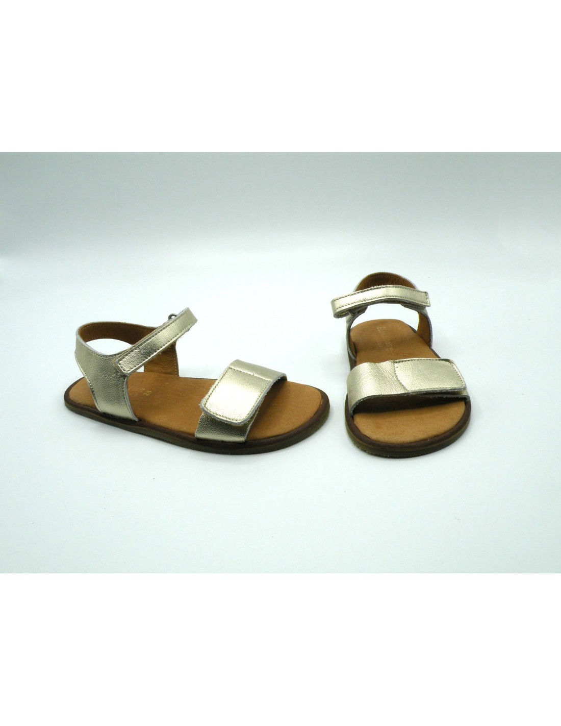 Sandalia barefoot en piel laminada de color champán, velcro en la pala y en el empeine, piso flexible de goma antideslizante.