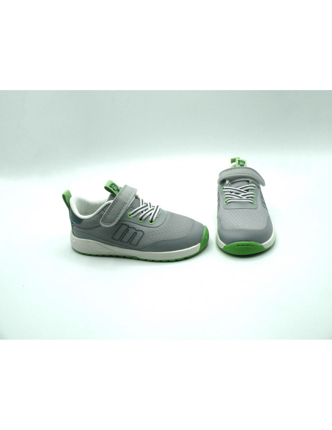 Deportiva barefoot en sintético de color gris/verde, cordón elástico y velcro, piso flexible de goma antideslizante.