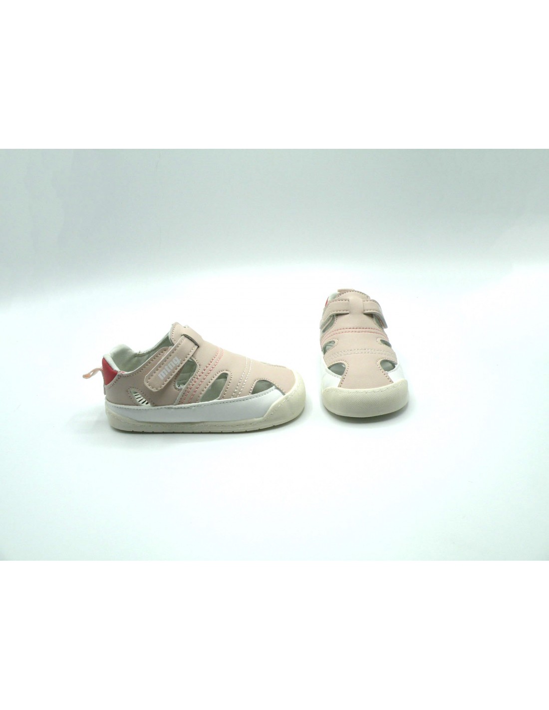 Sandalia barefoot en sintético de color rosa, velcro y piso flexible de goma antideslizante.