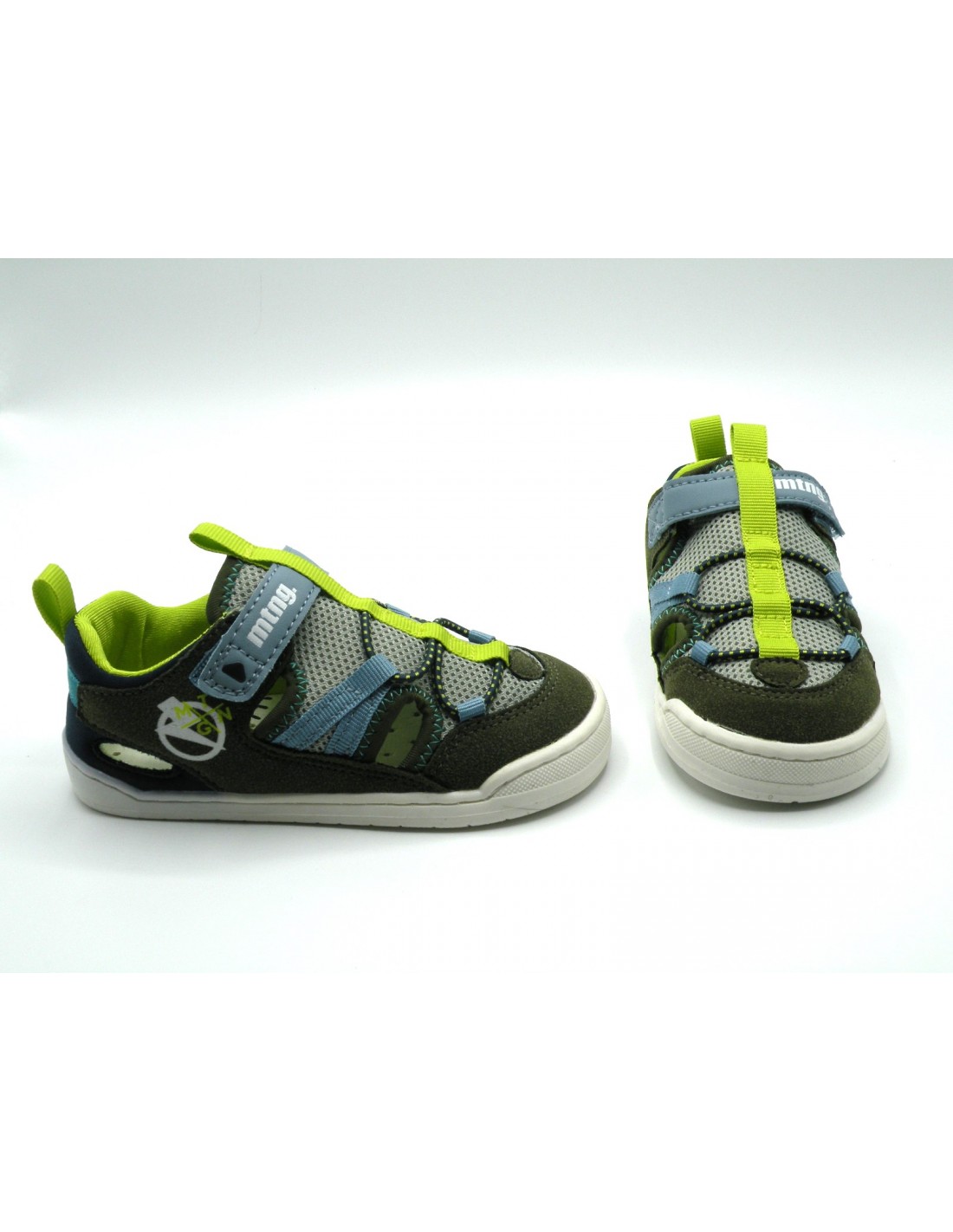 Sandalia deportiva barefoot, en sintético de color kaqui, velcro y piso flexible de goma antideslizante.