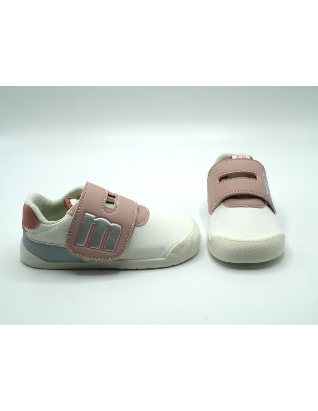 Deportiva barefoot en textil/sintético de color blanco/rosa, con velcro y piso flexible de goma antideslizante.