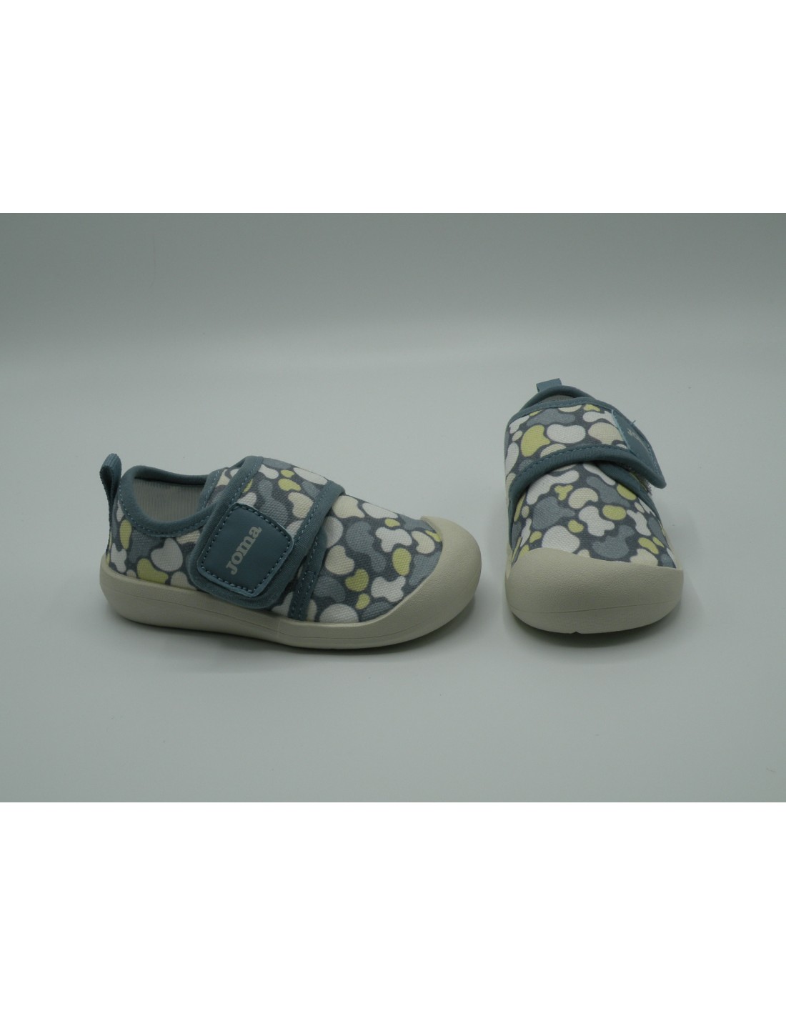 Zapatilla barefoot de lona en estampado de color azul, velcro y piso flexible de goma antideslizante.