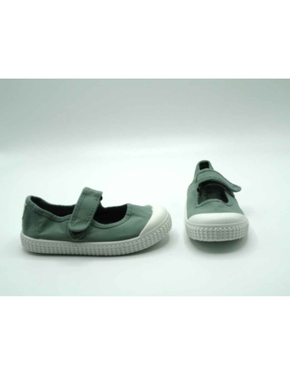 Merceditas de lona en color verde jade, velcro, piso de goma antideslizante. OJO CALZA JUSTO.