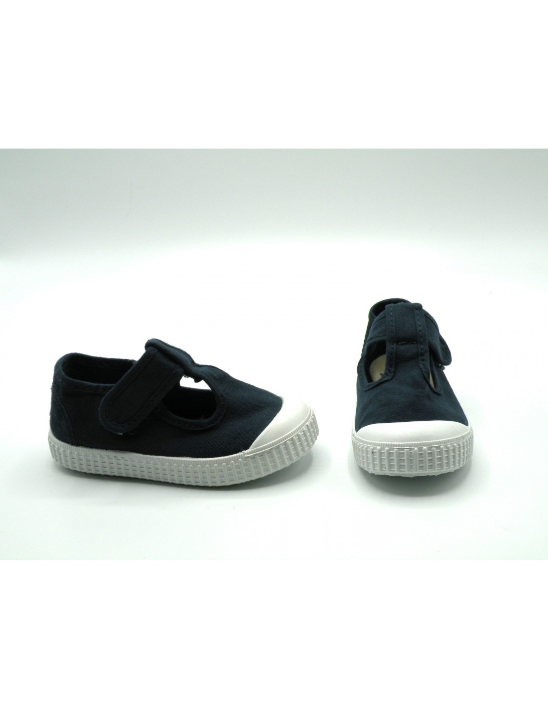 Zapatilla de lona en color marino, velcro y piso de goma antideslizante. OJO CALZA JUSTO.